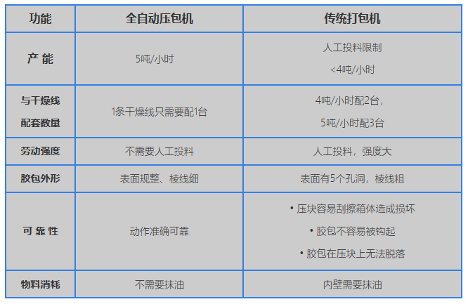 目前膠廠一條4 噸/小時生產線每一班次的干燥和包裝工序至少需要11人,其中進車、卸車、壓包環節操作人員的勞動強度較大。在國內勞動力短缺的背景下,提高設備的自動化水平,減少用工量,已成各行業的趨勢